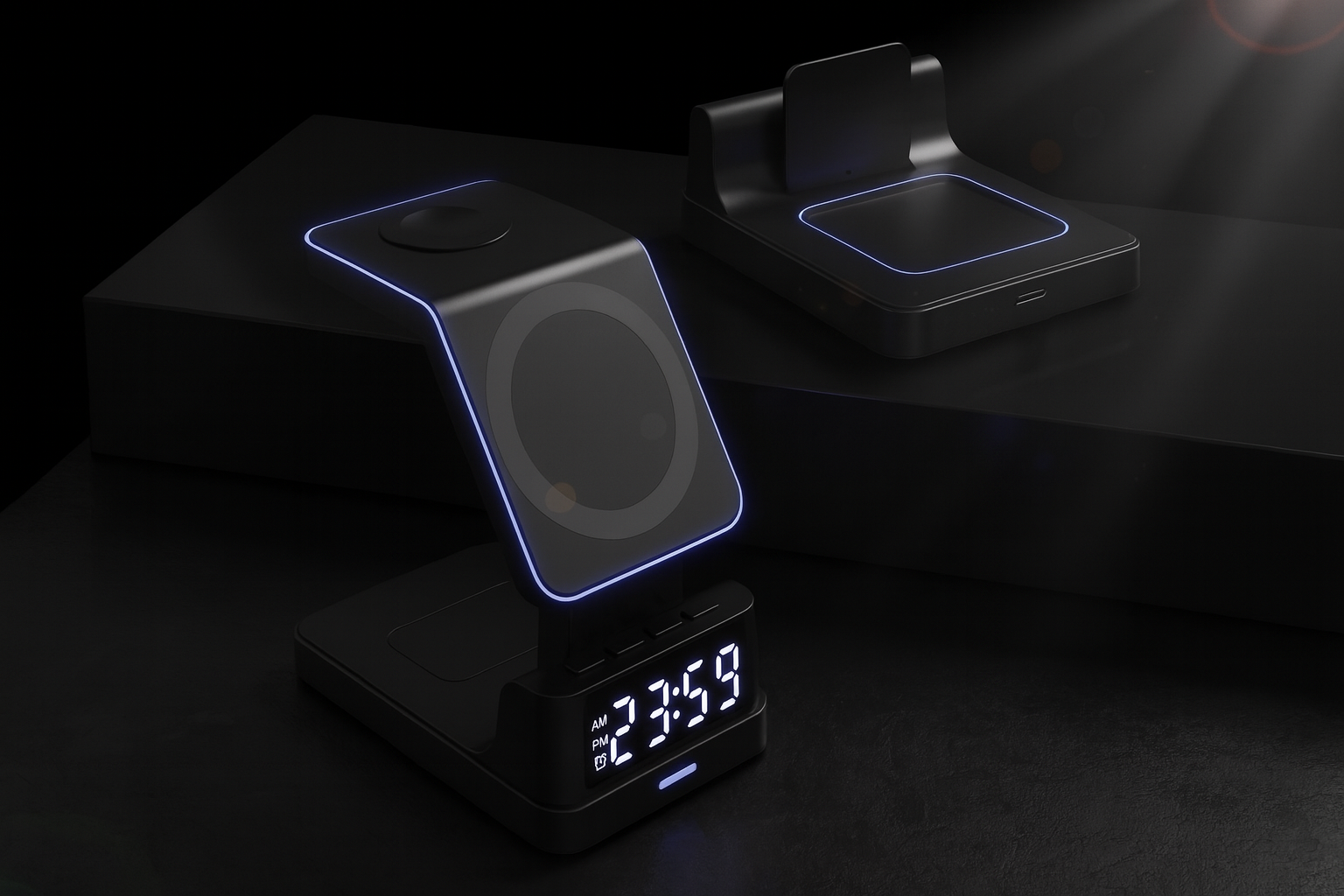Keep your phone, watch, and earbuds charged in one sleek spot with our 3‑in‑1 wireless charging station. Just drop your devices on the stand and let them power up together while the built‑in clock keeps you on schedule.